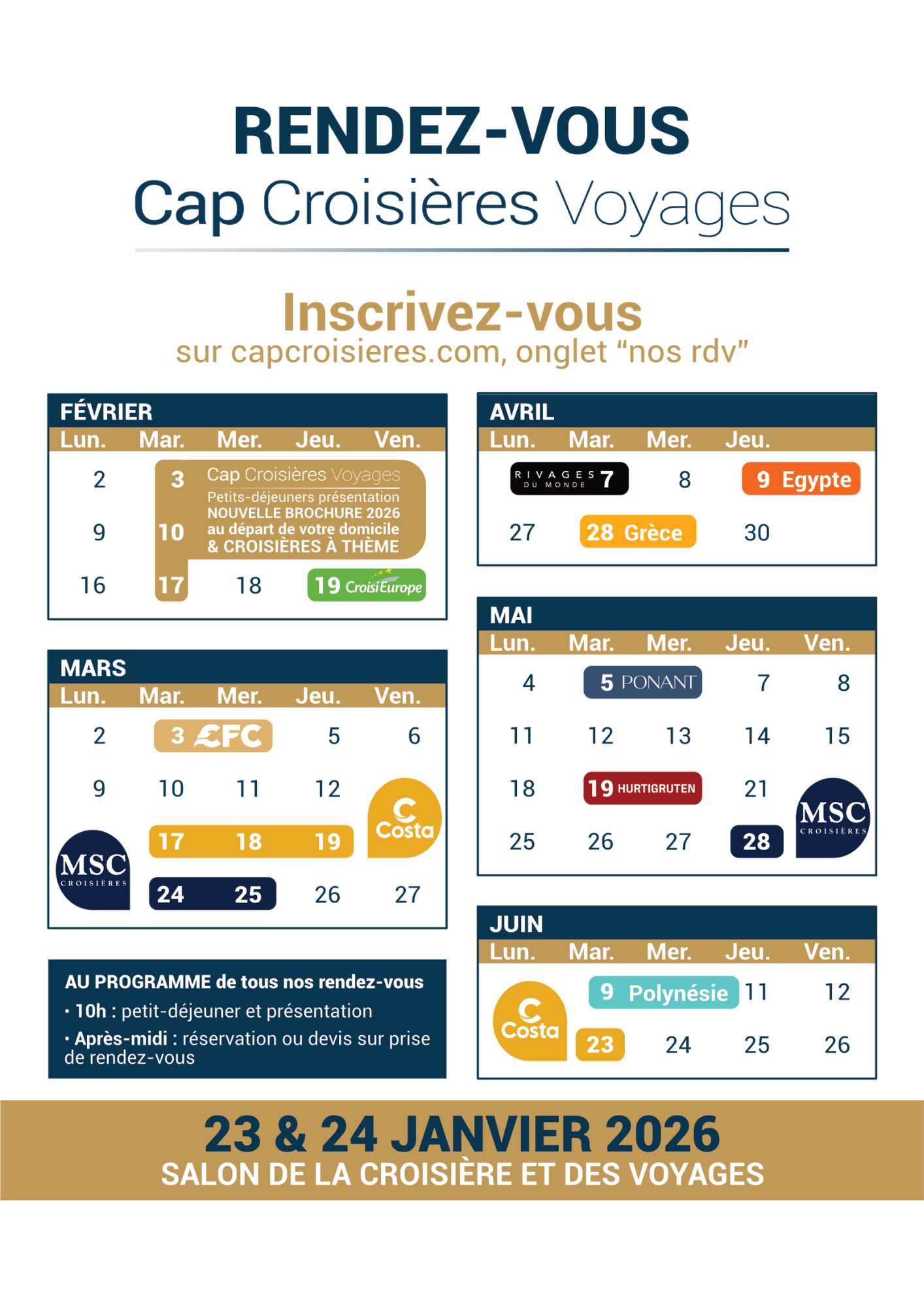 - Les mardis 3, 10 et 17 février : Petits-déjeuners présentation de la nouvelle brochure au départ de votre domicile & des croisières à thème uniquement disponibles chez Cap Croisières Voyages